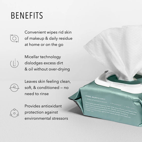 Convenient, hydrating cleansing wipes designed to remove makeup, pollutants, and daily buildup in one effortless step.
