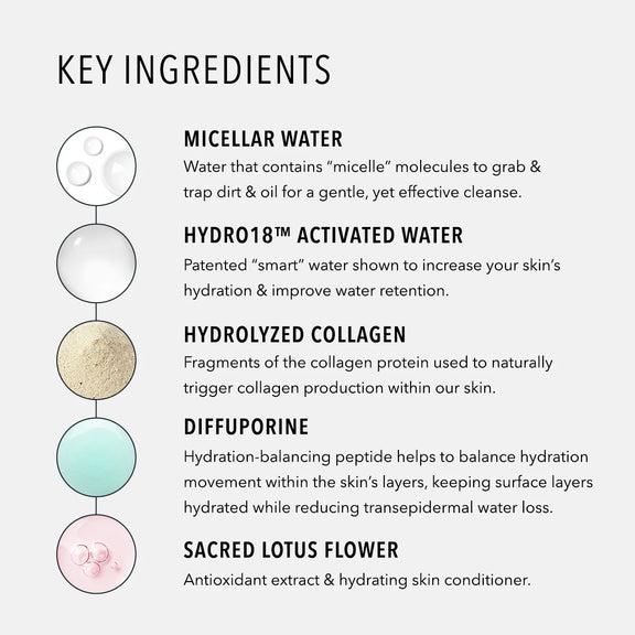 These gently textured cloths combine micellar water and HydrO18™ Activated Water to effectively cleanse while maintaining optimal hydration. Infused with collagen-supporting peptides and nourishing antioxidants, they help protect against environmental stressors while leaving skin refreshed, balanced, and glowing.